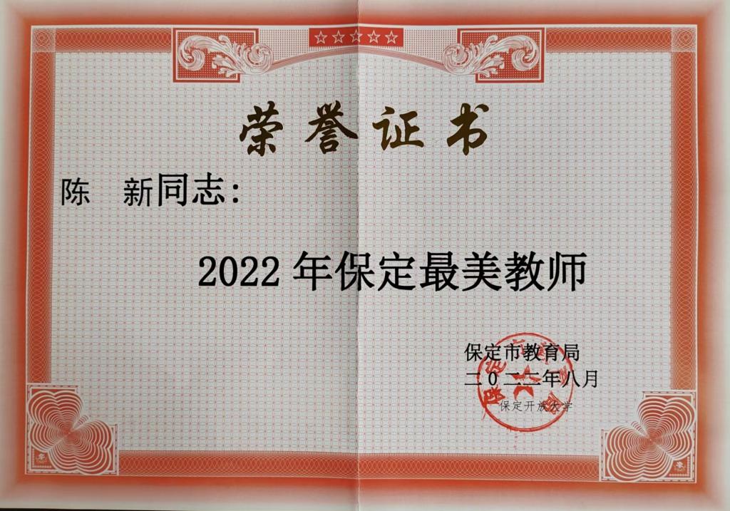 近日,保定市教育局公布2022年“保定最美教师”名单,我校陈新老师荣获“保定最美教师”荣誉称号。