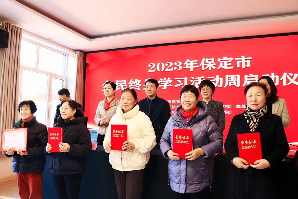 仪式上,对2023年“百姓学习之星”“终身学习品牌项目”及蠡县社区教育优秀社团和个人进行了表彰并颁奖。随后,与会人员参观了蠡县开放大学校园及社区教育功能室,近距离感受终身学习的魅力和丰富多彩的社区教育活动成果。