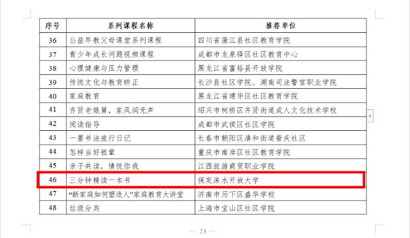 近日,教育部下发了《关于推介2023年县域社区学习中心典型案例和社区教育品牌课程的通知》,公布了100项县域社区学习中心典型案例、300门社区教育品牌课程的推介名单。其中,乐竞在线注册体系两门课程《三分钟精读一本书》《美术手工》分别入选县域社区教育品牌课程“家庭教育指导”和“人文艺术”类别名单,被正式纳入国家智慧教育公共服务平台与国家开放大学终身教育平台,面向全国范围开放共享。