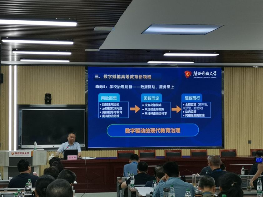 陕西开放大学党委书记龙治刚亲临现场,为参训学员们带来精彩的开班第一课,他从教育数字化转型的意义、数字化大学的内涵、数字化赋能高等教育的新领域、陕西开放大学的实践与探索及教育数字化转型的机遇与挑战等5个方面出发,为学员们分享陕西开放大学推进教育数字化转型发展的经验与做法。培训结尾,陕西开放大学校长吴宏梅以《凝心聚力谋发展提质增效强体系》为题进行授课。