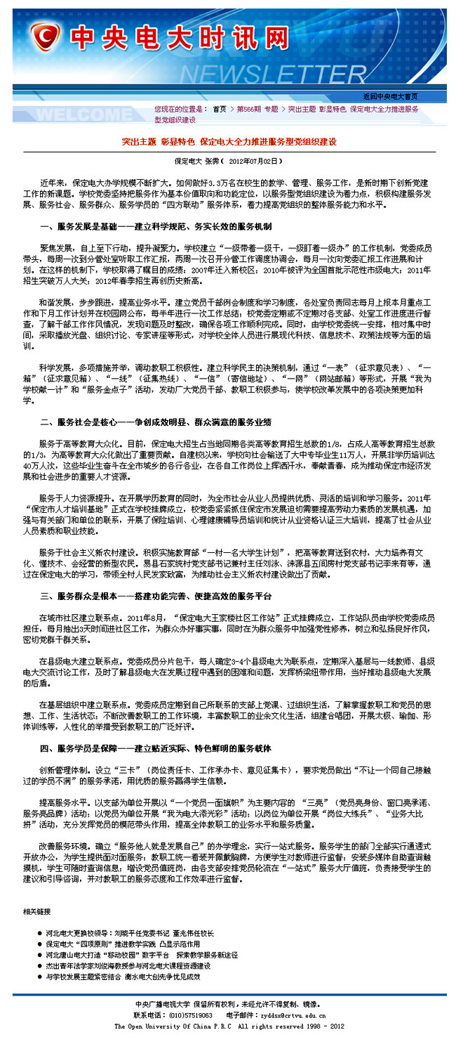 7月2日,《中央电大时讯》对我校服务型党组织建设情况进行报道