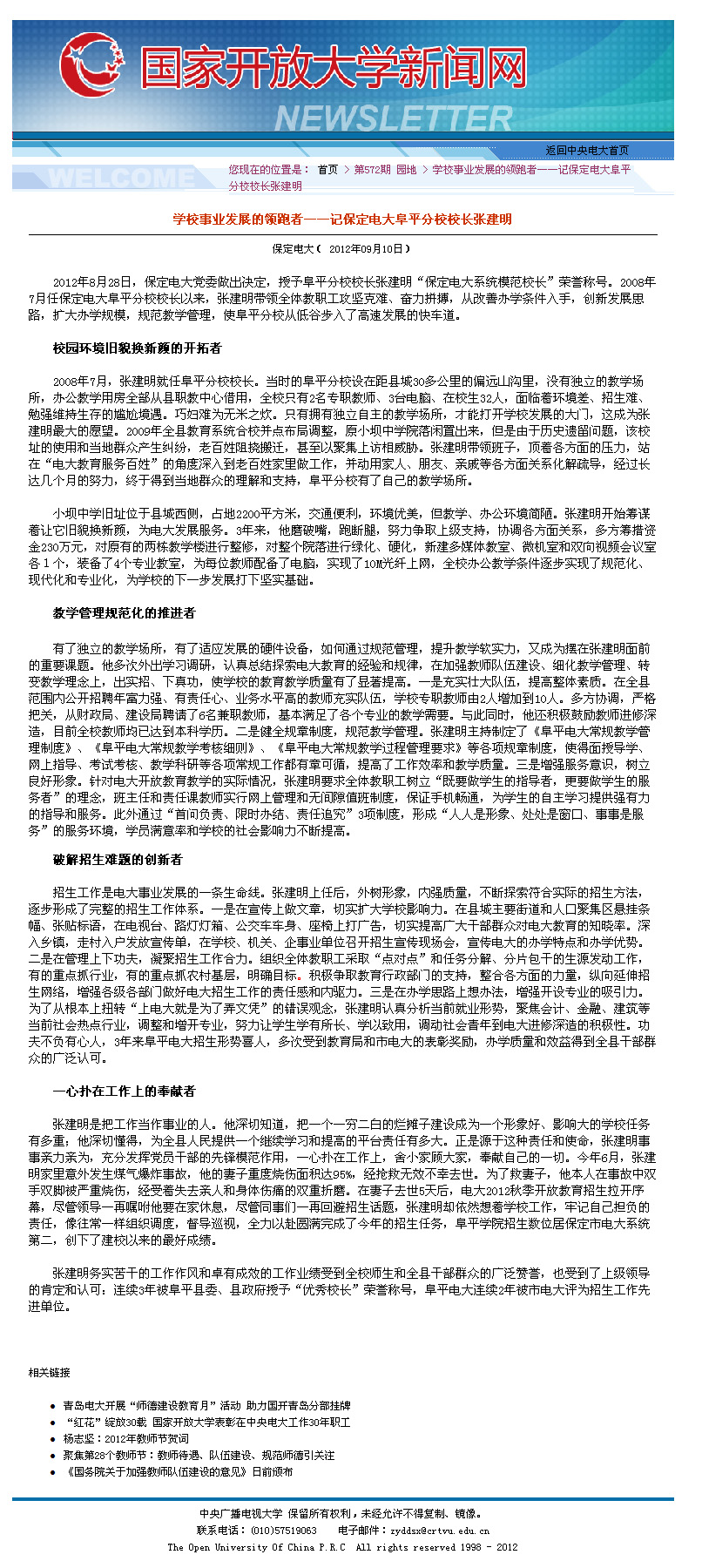 为庆祝第28个教师节的到来,《国家开放大学乐竞(中国)网》“园地”栏目从全国电大系统先进典型中选取保定电大阜平分校校长张建明同志的事迹进行报道,弘扬他无私奉献的崇高品质,爱岗敬业的精神风貌,自强不息的人生追求。原文如下: