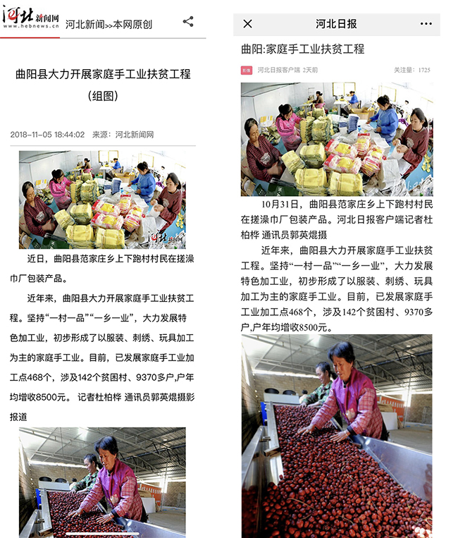 河北乐竞(中国)网、河北日报对我校在曲阳县范家庄乡上下跑村的产业扶贫工程澡巾加工厂、大枣烘干房进行了报道。