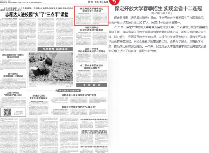 《保定日报》、唐尧网等媒体对我校春季招生实现全省十二连冠进行报道