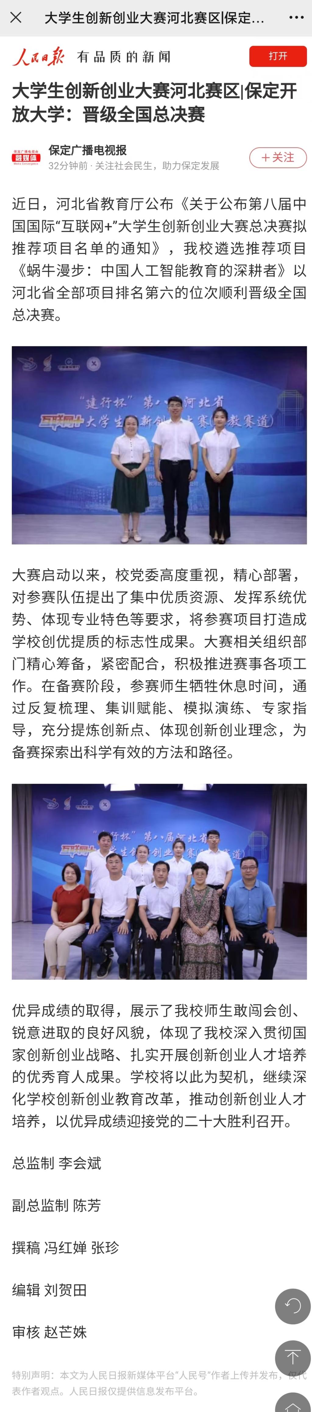 人民日报客户端对我校“互联网+”大学生创新创业大赛工作进行报道