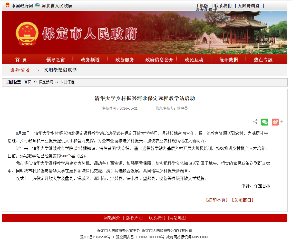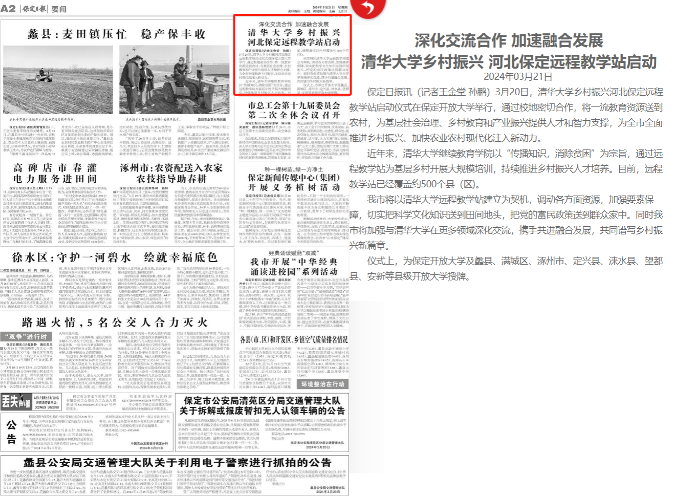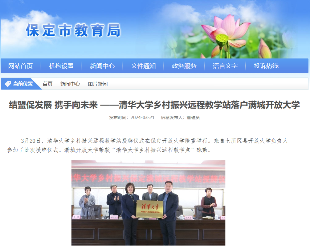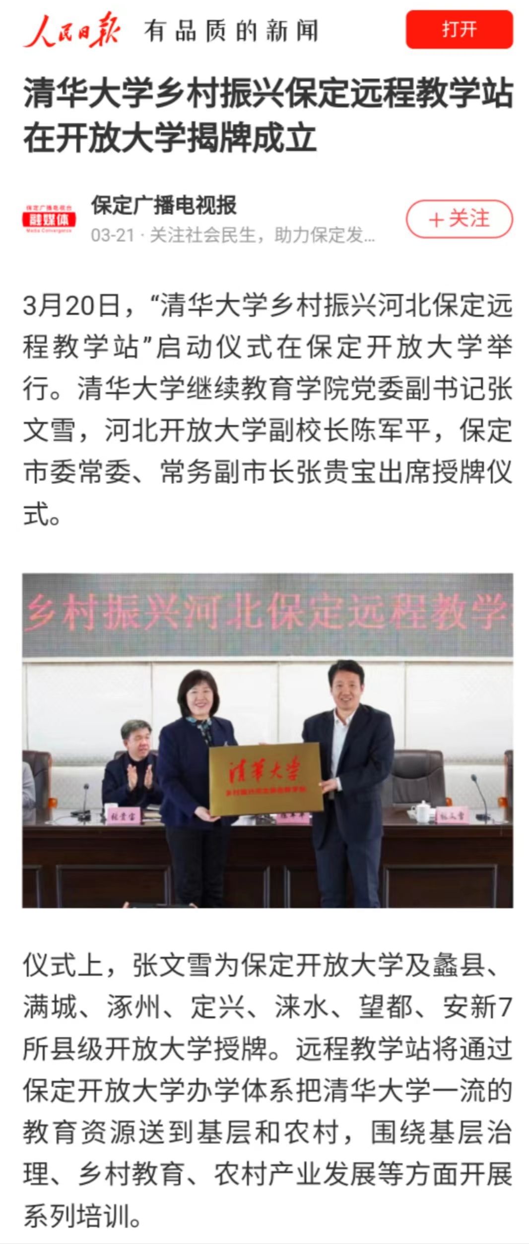 人民日报客户端、《保定日报》《保定晚报》、保定市人民政府、保定乐竞(中国)联播、保定教育在线、保定市教育局等多家官方网站、乐竞(中国)媒体对清华大学乡村振兴河北保定远程教学站在我校揭牌进行报道