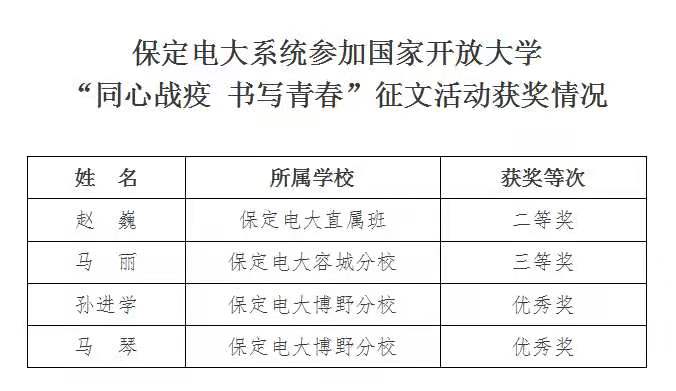 2020年6月,我校接到河北电大转发的《关于开展国家开放大学“同心战疫 书写青春”防疫抗疫故事征文活动的通知》后,在全系统范围内积极组织学员参与活动。县级电大和直属班学员纷纷踊跃参加征文活动,共报送征文70余篇。我校在河北电大组织的评选中,成绩突出。其中,全省一等奖10篇,我校4篇;全省二等奖20篇,我校7篇;全省三等奖30篇,我校18篇;全省优秀奖39篇,我校23篇。我校获优秀组织奖(共三所市级电大获奖),相应获奖作品报送国家开放大学参赛。