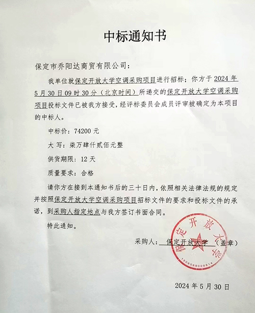 空调采购中标通知书