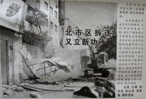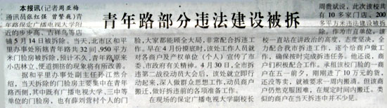5月15日《保定日报》头版报道我校“拆违”情况,全文摘要如下: 青年路保定广播电视大学附近的步步高、吉祥鸟等店铺5月14日被拆除。在现场的保定广播电视大学副校长周贵斌说,此次该校共有10多家门店、200多平方...