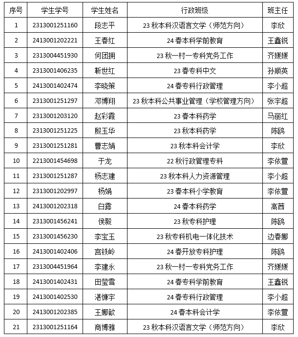 按照活动实施方案,依据2024学年度全年学生在线行为统计结果中学生平均在线天数、生均在线学习行为次数、发帖数、浏览数等关键数据和学生平时表现,经专家评审小组综合评审,确定21名开放教育学生被评选为2024年“网上学习之星”。