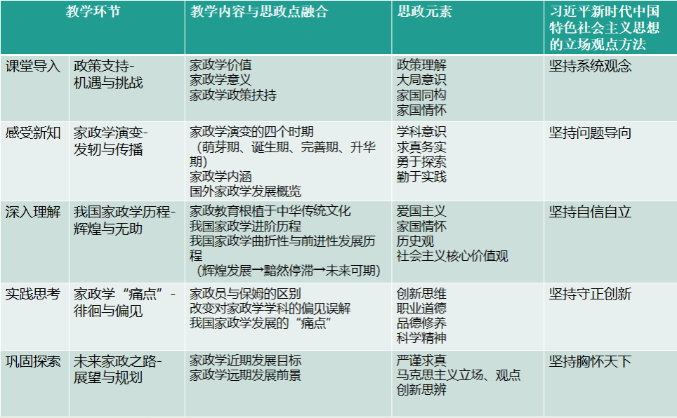 (1)在课程思政元素融入方面,坚持习近平新时代中国特色社会主义思想的立场观点方法,把握家政学的政策支持,探索家政学学科内涵,推动家政学向多元化,把中华传统家政文化与现代生活应用科学相结合,传承以儒家学说中“修身、齐家” 之道为核心的中华传统家政文化,适应时代转变和新时代家政学发展。