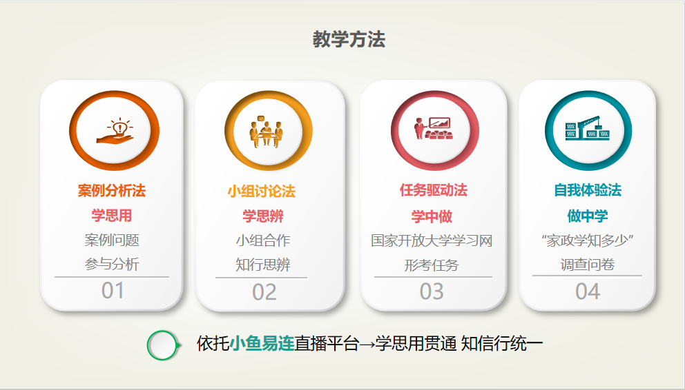 本课以培养学员丰富和拓展学员的家政学科视野,有助于学员更好地开展家庭生活为目标,将家政学进阶之路学习内容与思政元素结合融汇于知识学习、能力培养、价值塑造中,引领学员回顾历史,立足现实,传承家国同构的家国情怀。